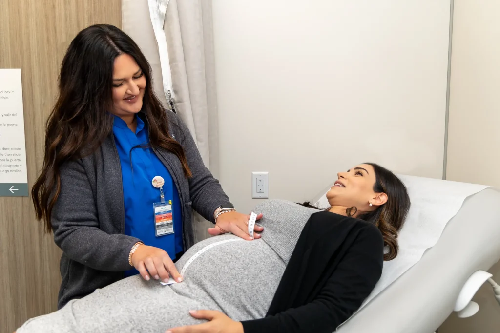 A healthcare professional measures the belly of a pregnant woman lying on an examination bed. Both women are smiling. The professional is wearing a blue shirt and gray cardigan with a badge. The setting is a medical office.